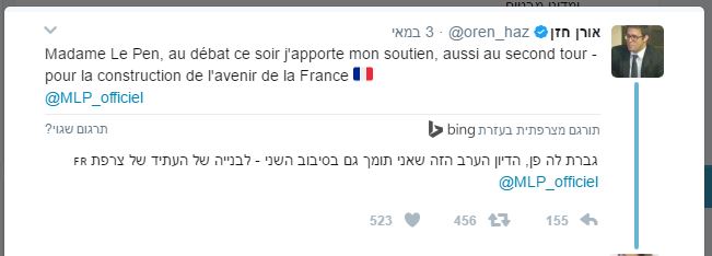 הבחירות בצרפת, נערכות היום, וביומן הצהריים ברדיו 'קול ברמה' התראיין ח"כ אורן חזן (הליכוד) שהביע תמיכה דווקא במועמדת הימין הקיצוני מארי לה-פן.