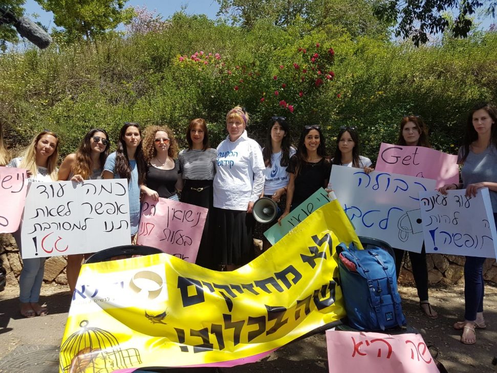 מיכל אורבנו רכזת תא נאמני תורה ועבודה באוניברסיטה העברית, ממארגנות ההפגנה: ״הגענו לתמוך במסורבות הגט, בצביה ואלישבע, לתמוך בחוק הפקעת קידושין ולשים סוף לבעיית העגונות, ולשחרר אותן לחופשי מכבלי הנישואים״.