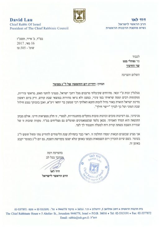 מרן הרב הראשי לישראל הרב דוד לאו, שיגר היום מכתב ברכה לשר החינוך נפתלי בנט, בעקבות החלטתו לדחות את חופשת ל"ג בעומר ביום, מה שהביא לירידה משמעותית בחילול השבת.