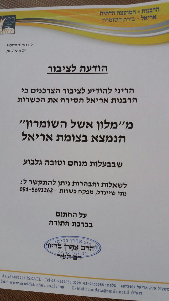בהודעה שפירסם הרב אהרון בדיחי, רב העיר אריאל, נכתב "הריני להודיע לציבור הצרכנים כי הרבנות אריאל הסירה את הכשרות מ"מלון אשל השומרון" הנמצא בצומת אריאל.