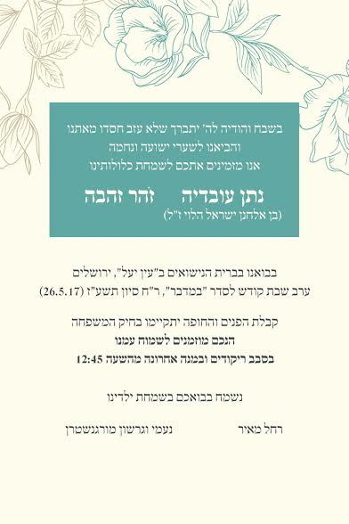 בעריכת חופה וקידושין התכבד רב היישוב עתניאל, הרב רא"ם הכהן. מי שעוד נטלה חלק בחופה היא הרבנית מיכל נגן ראש המכינה הקדם צבאית לבנות דתיות 'צהלי'.