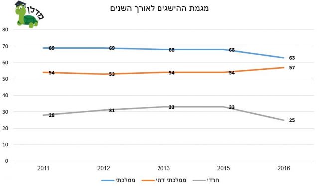 למרות זאת, תלמידי החינוך הממלכתי דתי רשמו עלייה בממוצעי הציונים בכל המקצועות בהשוואה לנתוני השנה הקודמת, בעוד שממוצעי המקצועות בקרב תלמידי החינוך הממלכתי והחרדי היו גבוהים יותר בשנת 2015.
