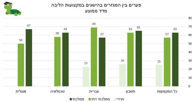 כך למשל ממוצעי ההישגים במתמטיקה היו 65 בחינוך הממלכתי, 63 בחינוך הממלכתי דתי ו-23 בחרדי. באנגלית נרשם ממוצע של 67 בחינוך הממלכתי לעומת 50 בחינוך הממלכתי דתי, ובטכנולוגיה 63 לחינוך הממלכתי ו-58 בחינוך הממלכתי דתי.
