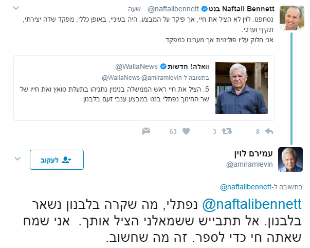 לוין כאמור לא נשאר חייב, והשיב לבנט: "נפתלי, מה שקרה בלבנון נשאר בלבנון. אל תתבייש ששמאלני הציל אותך. אני שמח שאתה חי כדי לספר. זה מה שחשוב".