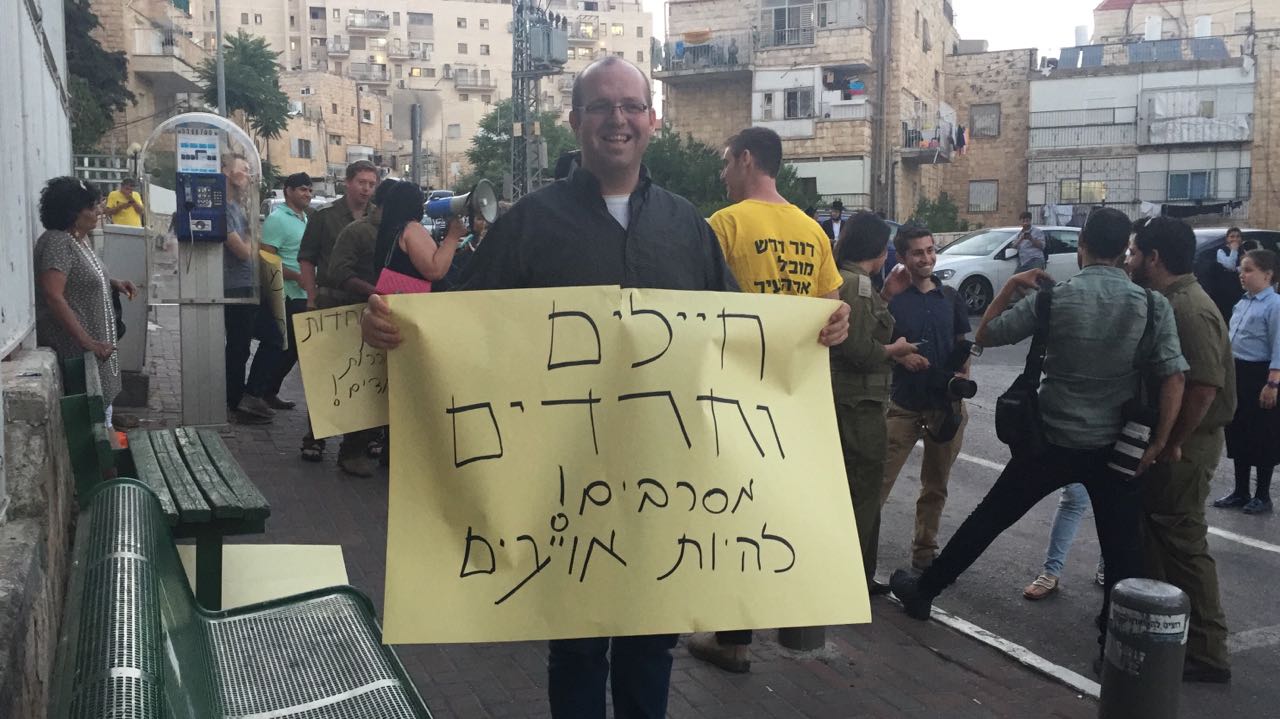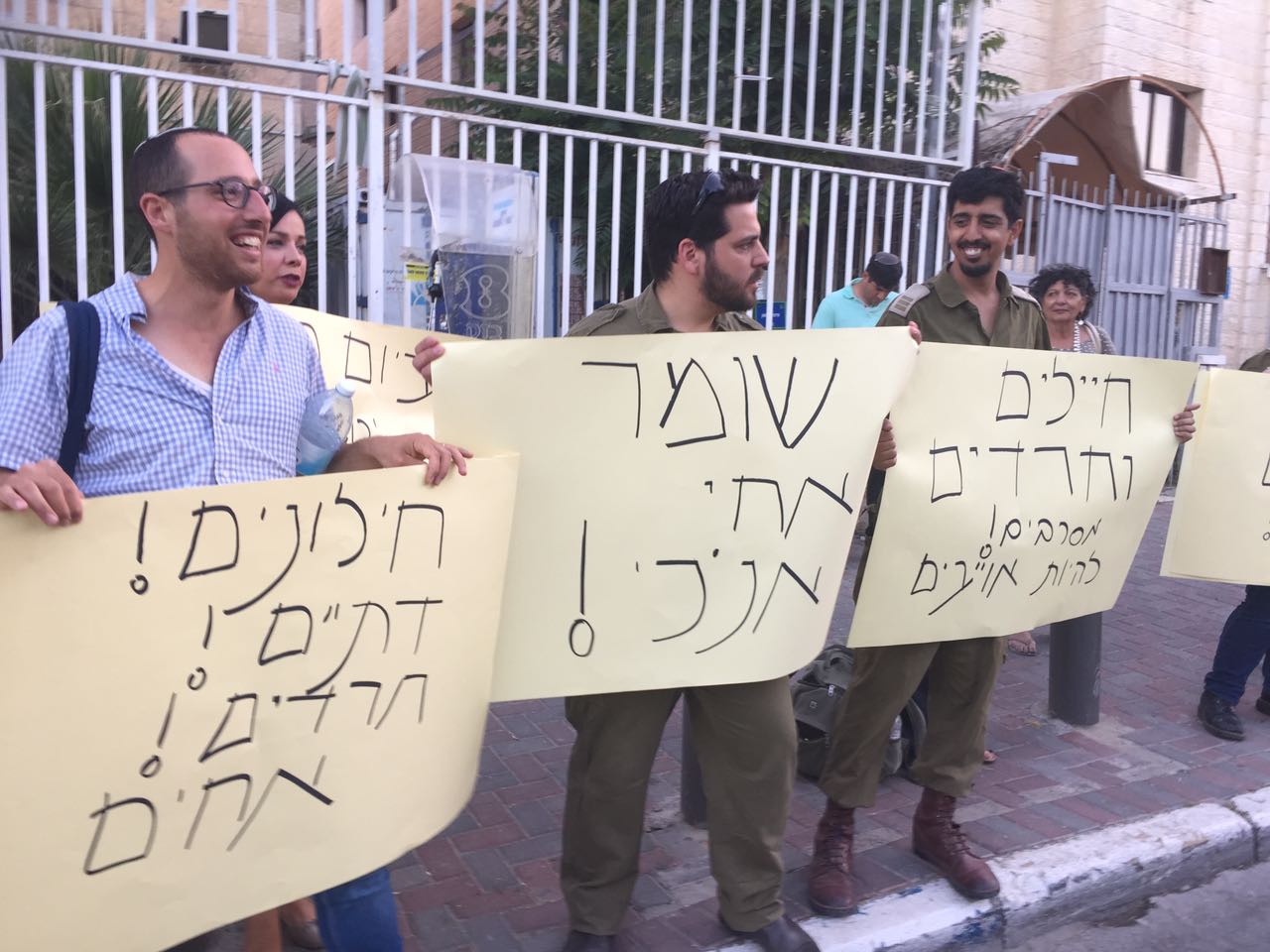 בהפגנה דיבר סגן ראש העיר עופר ברקוביץ ואמר: אני מברך את הירושלמים היקרים שהצטרפו אלינו הערב להעביר מסר של אחדות ושל תקווה, נגד אלימות ובעד חיילי צה"ל ששומרים אלינו. הסרטון המזעזע שהופץ מוכיח כי חיילים חרדים מאויימים ונפגעים מקיצונים אלימים הוא קריאת אזהרה לכולנו. הוא מחייב אמירה ציבורית חזקה מנגד, שתבהיר שנילחם באותם גורמים המטילים אימה על כל חייל ובוודאי חייל חרדי. תפקידה של ההפגנה הערב לבודד קבוצה קיצונית בחברה החרדית ולמנוע את הכתמת הציבור כולו. חיילי צה"ל שומרים עלינו, ואנחנו נשמור עליהם!