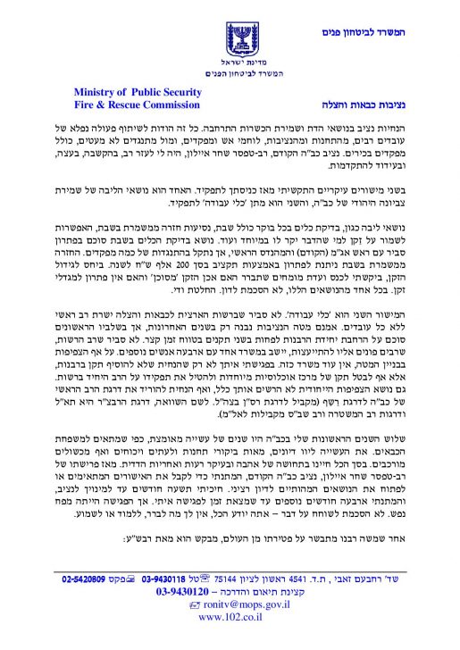 במכתב ההתפטרות שהגיע לידי 'בשבע', טוען הרב פרל כי מאז מינוי הנציב החדש, נפגעה יכולתו למלא את תפקידו. "בשני מישורים עיקריים התקשיתי מאז כניסתך לתפקיד. האחד, הוא נושאי הליבה של שמירת צביונה היהודי של כב"ה, והשני הוא מתן 'כלי עבודה' לתפקיד", והוא מפרט את סוגיות הליבה כשבראשן שמירת השבת: "בדיקת כלים בכל בוקר כולל שבת, נסיעות חזרה ממשמרת בשבת", ומציין כי סוגיה זו סוכמה כבר בעבר בשיחות עם ראש אג"מ והמהנדס הראשי של המערך.