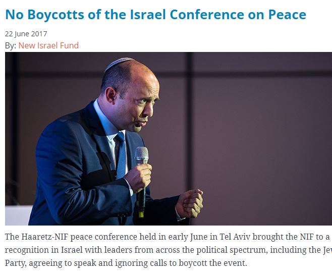 וזה מה שהיה להם לכתוב על האירוע: "אין חרמות בוועידת ישראל לשלום. ועידת הארץ והקרן החדשה לשלום הביאה את הקרן לרמה חדשה של הכרה, כאשר מנהיגים מכל רחבי הקשת הפוליטית, כולל ממפלגת הבית היהודי, הסכימו לנאום בוועידה והתעלמו מקריאות להחרים את האירוע".