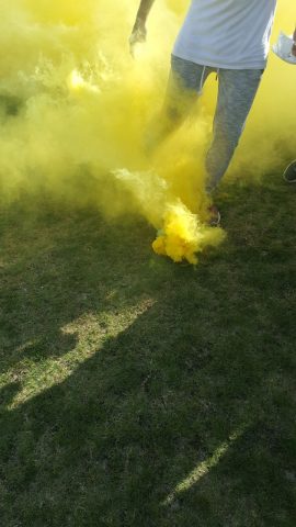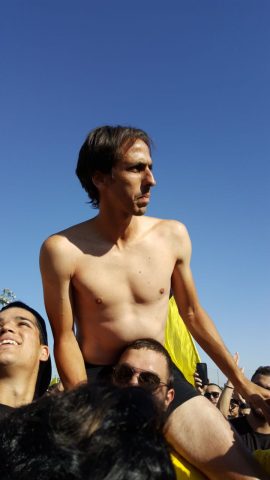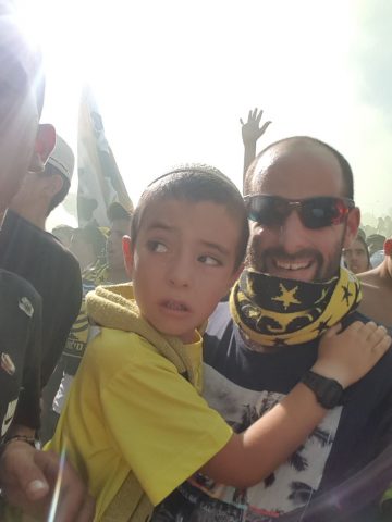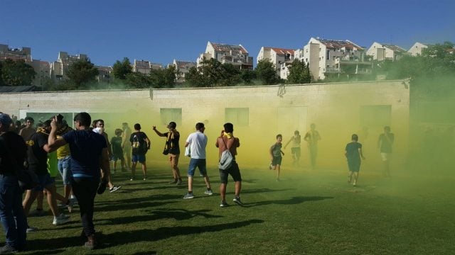 אוהדי בית"ר חוגגים בדרך לאימון הפתיחה (צילום: יהודה נאמבורג)