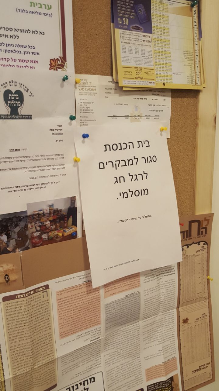 אתמול (ב') הגיעו מספר פעילים לבית הכנסת שבמשכן, ותלו על הדלת ועל לוח המודעות שלטים בהם נכתב "בית הכנסת סגור למבקרים לרגל חג מוסלמי."
