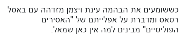 בעקבות הדברים התעורר זעמו של בן כספית שכתב: "כששומעים את הבהמה עינת ויצמן מזדהה עם באסל רטאס ומדברת על אפלייתם של "האסירים הפוליטיים" מבינים למה אין כאן שמאל".