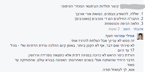 עמרוסי, שבדרך כלל מנהלת דיונים עניניים בעמוד הפייסבוק שלה גם מול מתנגדיה, לא יכלה שלא להתייחס לתגובה הפוגענית וכינתה את אותו הגולש "חצוף". לאחר מכן היא כתבה: "זה ממש לא עניינך אבל הצלחת להרגיז אותי".