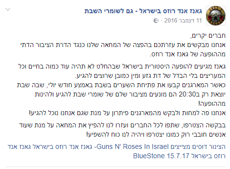 עוד הסביר מנשה "השבת יוצאת נורא מאוחר, גם ככה זה על הקסקס. אתה צריך לעשות איזושהי הבדלה, ולהגיע עם הלשון בחוץ וזה לא פשוט. להקדים ל-20:00 אומר בעצם לא להגיע להופעה. וחבל. כנראה שהם לא מאמינים בלהקה שיש להם מעריצים שומרים שבת, הם לא חיברו בין זה לזה. אבל הנה – כנראה שיש להם".