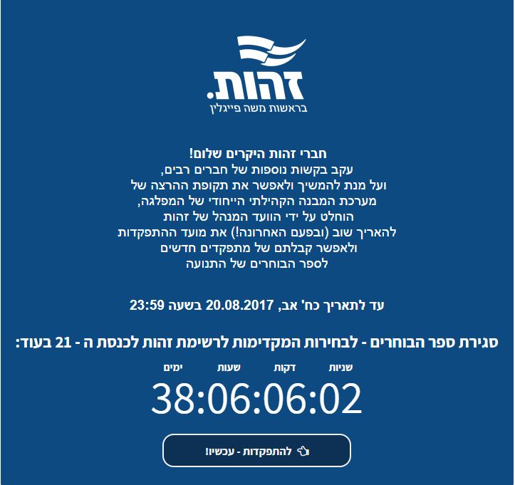 בתחילת השבוע שיגרה המפלגה הודעה "חברי זהות היקרים שלום! עקב בקשות של חברים רבים, ועל מנת לאפשר את תקופת ההרצה של המבנה הקהילתי הייחודי של המפלגה, הוחלט על ידי הוועד המנהל של זהות להאריך את מועד ההתפקדות ולאפשר קבלתם של מתפקדים חדשים לספר הבוחרים של התנועה." התאריך החדש לסגירת ספר המפקד הוא ל-20 באוג' 17' כ"ח באב.