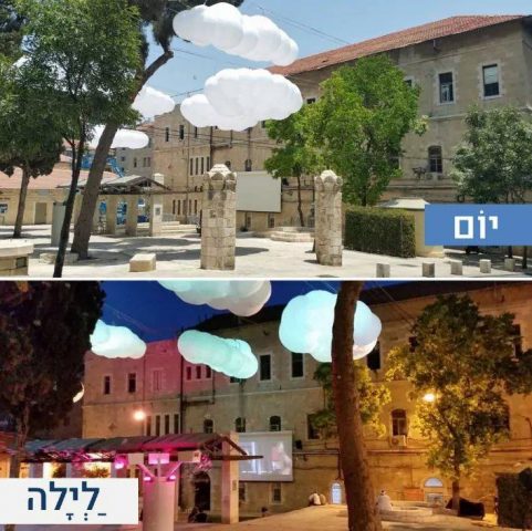 מיצג עננים – 7 ענני ענק מרשימים מרחפים מעל הכיכר ומייצרים צל לשעות היום, לנוחיותם של העוברים ושבים. בערבים ,תאורה מתחלפת מנעימה את האווירה בכיכר על רקע העננים.
