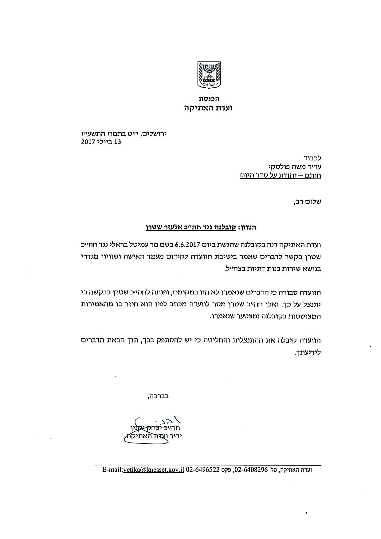 מלשכת ח"כ אלעזר שטרן נמסר: במסגרת יום ההוקרה לחיילות הדתיות שארגן ח"כ שטרן הציג נציג הארגון בועדה סירטון שמבזה נשים ופוגע בנשים בכלל ובחיילות צה"ל בפרט. ח"כ שטרן הביע מחאה על הצגת הסירטון במשכן הכנסת.