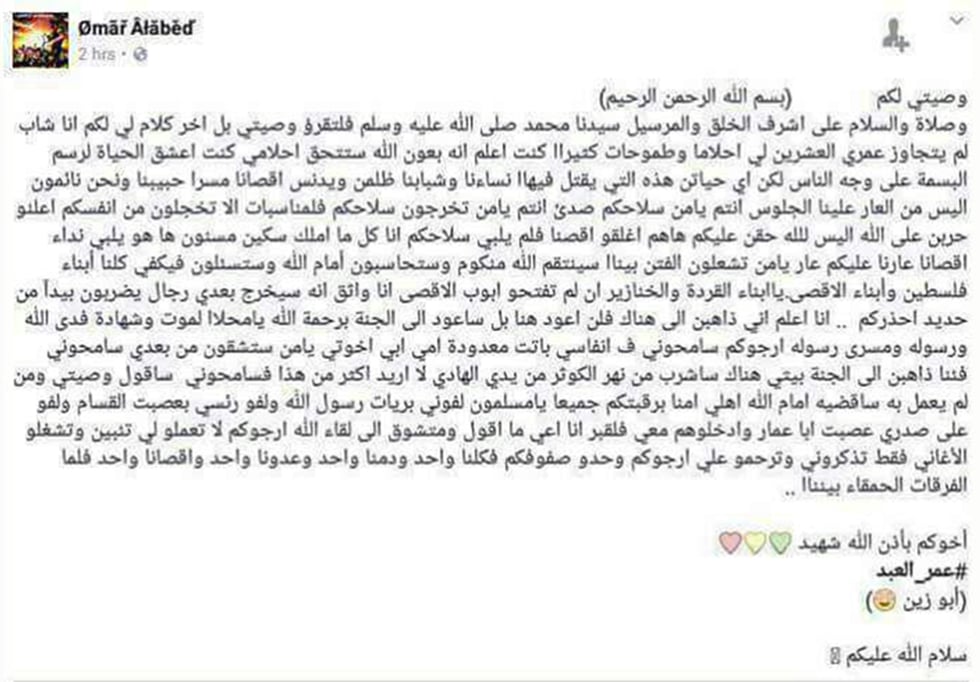 אל-עבד פרסם כשהחל לצעוד לעבר חלמיש צוואה בפייסבוק: "צוואתי לכם. אני נער שעדיין לא הגיע לגיל 20. יש לי חלומות ושאיפות רבות. אני יודע שבעזרת אללה יתגשמו חלומותיי. אהבתי את החיים, לגרום לאנשים לחייך, אך אילו חיים הם אלה? הורגים את הנשים והצעירים שלנו, מטנפים את אל אקצה שלנו ואנחנו ישנים. קחו את הנשק שלכם ותתנגדו. הכריזו מלחמה על אללה, סגרו את אל-אקצה, ומה עם הנשק שלכם? לי יש רק סכין והוא ייענה לזעקתו של אל-אקצה".