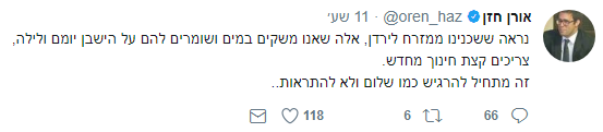 חבר הכנסת אורן חזן מהליכוד, צייץ בחשבון הטוויטר שלו בשעה 21:53, כשעתיים לאחר תחילת התקרית: "נראה ששכנינו ממזרח לירדן, אלה שאנו משקים במים ושומרים להם על הישבן יומם ולילה, צריכים קצת חינוך מחדש". בסוף הציוץ הוסיף חזן: "זה מתחיל להרגיש כמו שלום ולא להתראות".