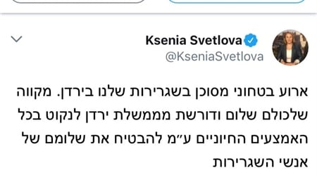 "אירוע ביטחוני מסוכן בשגרירות שלנו בירדן", כתבה סבטלובה אף היא בחשבון הטוויטר שלה. "מקווה שלכולם שלום ודורשת מממשלת ירדן לנקוט בכל האמצעים החיוניים ע"מ להבטיח את שלומם של אנשי השגרירות".