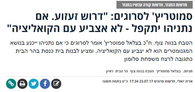 בהתייחס להצהרתו בתחילת השבוע בראיון לסרוגים, לפיה במקרה של התקפלות הממשלה בנושא המגנומטרים בהר הבית, לא יצביע עם הקואליציה הבהיר סמוטריץ': "ההתחייבות תמומש. כפי שהודעתי ומאחר ולצערי רה"מ נכנע לטרור ולאלימות וקיבל החלטה מסוכנת שפוגעת בביטחון ישראל לא אוכל להצביע עם הקואליציה."