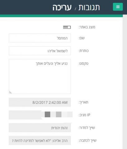 אחת התלונות נפתחה אתמול בעקבות תגובה שהגיעה לאתר החדשות הקול היהודי, לכתבה על דברי הרב, בידי מגיב שכינה עצמו "המחסל" ואיים לפגוע ברב. התגובה הועברה בידי לשכת הרב אליהו למשטרה, וחוקר משטרה יצר קשר עם אתר הקול היהודי לצורך העברת חומרים בעניין לאיתור המאיים.