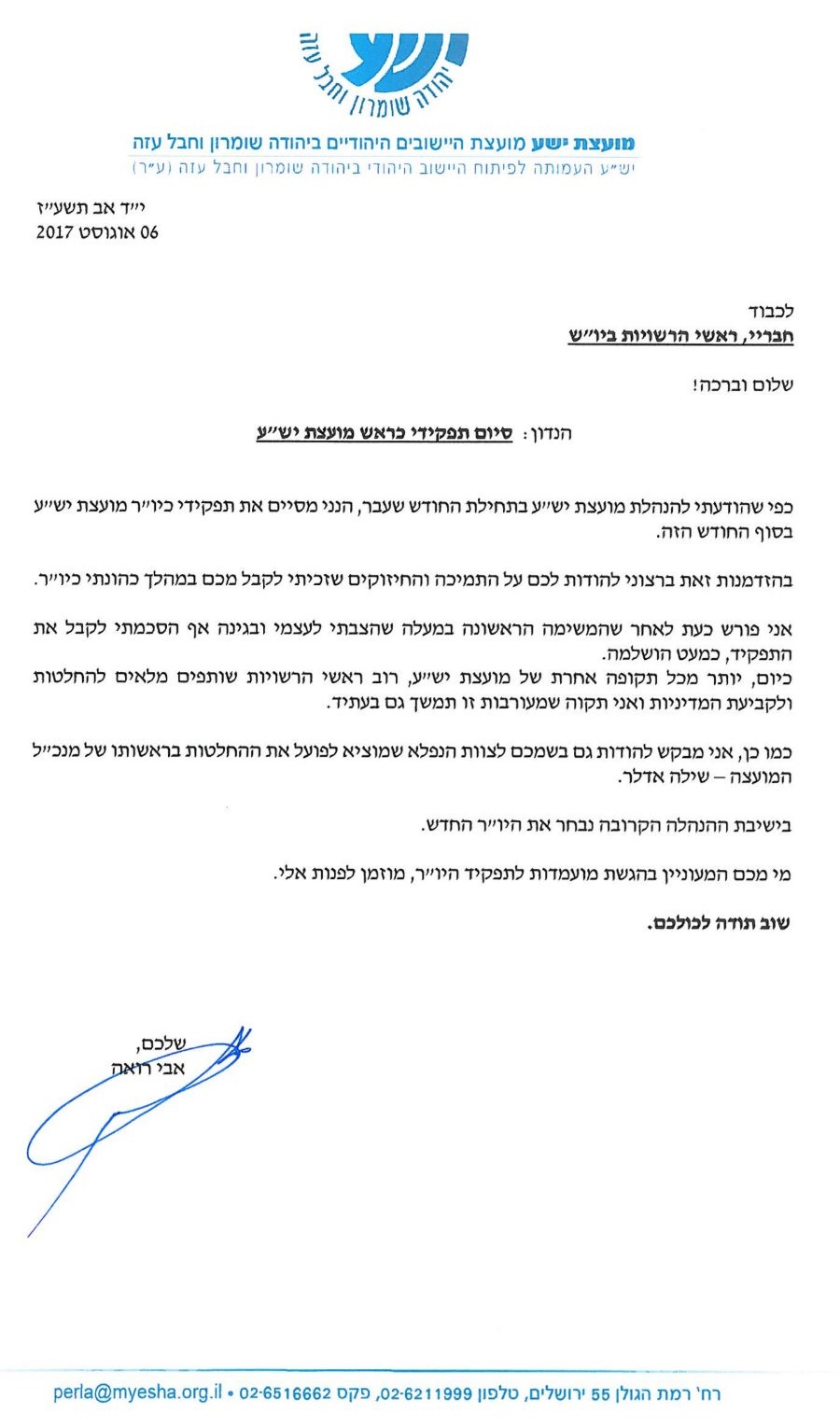 מכתב הפרישה של אבי רואה ממועצת יש"ע
