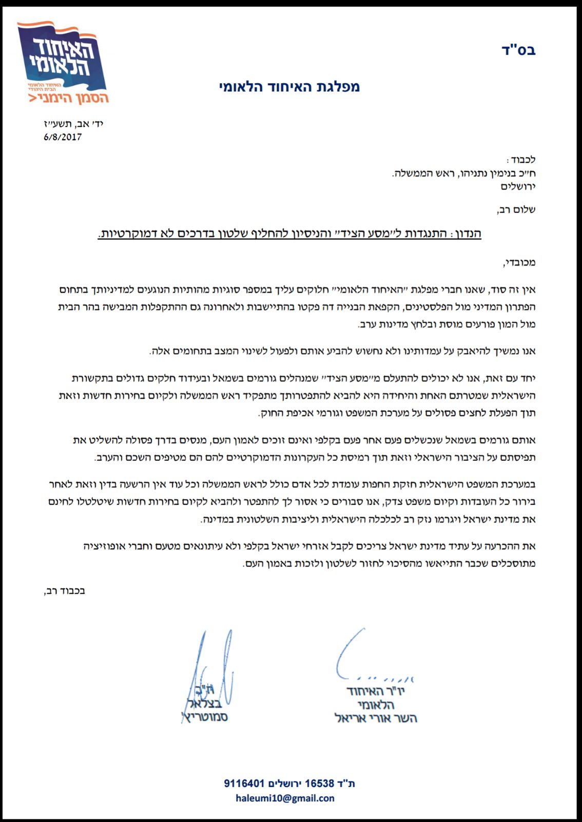 "במערכת המשפט הישראלית חזקת החפות עומדת לכל אדם כולל לראש הממשלה וכל עוד אין הרשעה בדין וזאת לאחר בירור כל העובדות וקיום משפט צדק, אנו סבורים כי אסור לך להתפטר ולהביא לקיום בחירות חדשות שיטלטלו לחינם את מדינת ישראל ויגרמו נזק רב לכלכלה הישראלית וליציבות השלטונית במדינה. את ההכרעה על עתיד מדינת ישראל צריכים לקבל אזרחי ישראל בקלפי ולא עיתונאים מטעם וחברי אופוזיציה מתוסכלים שכבר התייאשו מהסיכוי לחזור לשלטון ולזכות באמון העם", כתבו השר אורי אריאל וח"כ בצלאל סמוטריץ'.