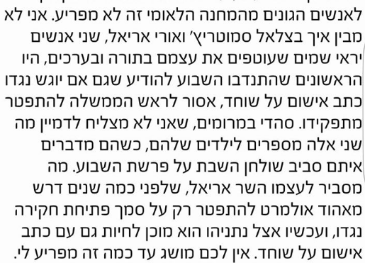 חבר הכנסת בצלאל סמוטריץ' מהבית היהודי, משיב לדבריו של העיתונאי קלמן ליבסקינד, שתהה בטורו כיצד חברי הכנסת סמוטריץ' ואורי אריאל, החיים חיים תורניים, קוראים לנתניהו שגם במקרה של כתב אישום עליו לא להגיש התפטרות.