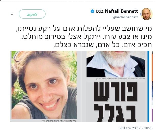 בתגובה לפרסום, צייץ הבוקר בנט את הפרסום בידיעות והוסיף: "מי שחושב שעליי להפלות אדם על רקע נטייתו, מינו או צבע עורו, ייתקל אצלי בסירוב מוחלט. חביב אדם, כל אדם, שנברא בצלם."