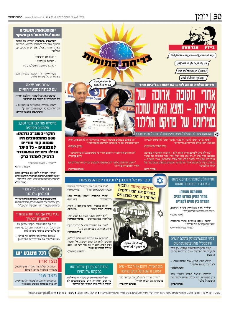 בריחת המוחות מדור הסאטירה של מקור ראשון והפעם: מה באמת עשו אותם מנגליסטים בגן סאקר ביום השואה, פרשת אולמרט והולילנד מסתעפת, עם ישראל בדרך לחגוג את יום העצמאות אבל להילרי יש תנאים וגם, מה הציע אהוד ברק לפולנים???