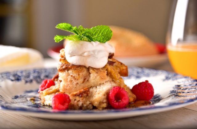 5. יוצרים 2 חריצים בנייר הכסף כדי לאפשר לאדים לצאת, ואופים במשך 45 דקות. מסירים את נייר הכסף ואופים 40-45 דקות נוספות, עד שהפודינג עולה למעלה ואינו נוזלי. מוציאים מהתנור ומקררים מעט. לאחר מכן מפזרים על הפרנץ' טוסט אבקת סוכר דרך מסננת קטנה, חותכים ל-8 ומגישים בצלחות אישיות עם סירופ מייפל בצד.