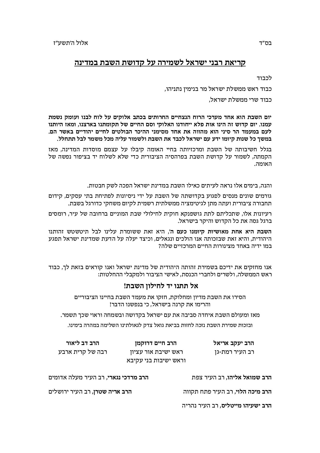 הרבנים הוסיפו כי כל אלה הם למעשה מתן גושפנקא חוקית לחילול שבת המוני. וכי השבת שומרת על זהותנו היהודית ולא יעלה על הדעת שמדינת ישראל תפגע במו ידיה באחד מצינורות החיים המרכזיים שלה״.