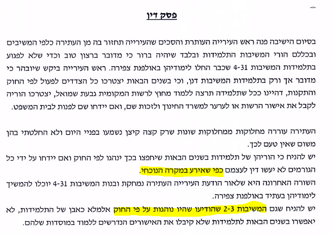 היה לנו ברור מההתחלה שלא נחזיר אף תלמידה שכבר נקלטה במוסד אחר, ומה שהיה כבר עשוי. ולכן הבנות של כיתה ז' שימשיכו שם עד סוף י"ב. פסק הדין הוא רק לגבי השנים הבאות וזה פסק דין שיש לנו כרגע ביד. השופט רצה למשוך את הדיונים עוד קצת, וכשאנחנו ראינו, שהשגנו את המטרה, שמשנה הבאה ייפסק נוהל הרישום בלי אישור לימוד חוץ, אמרנו שאין טעם להמשיך בהליך ומשכנו אותו.