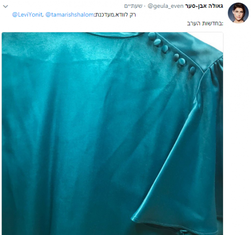 אבן סער העלתה ציוץ לחשבון הטוויטר שלה וכתבה: "רק לוודא, מעדכנת". לציוץ צירפה אבן- סער תמונה של חולצה בצבע טורקיז אותה היא צפויה ללבוש הערב. אבן סער אף תייגה את איש שלום ויונית לוי.