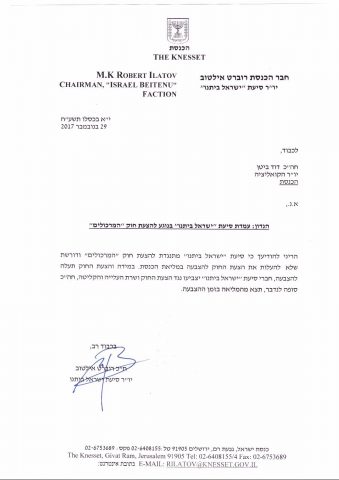 עוד כתבו במכתב כי במידה והצעת החוק כן תעלה להצבעה, חברי סיעת "ישראל ביתנו" יצביעו נגד הצעת החוק ושרת העלייה והקליטה, חה"כ סופה לנדוור, תצא מהמליאה בזמן ההצבעה.