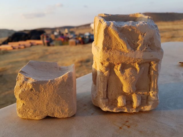 באחד מחדרי המבנה נחשפו שני מקטרים – כלי פולחן בדמות מזבח קטן. אחד משני המקטרים עוטר בדמות שור, שנראה כיושב בחזית מקדש שלו עמודים מפוארים. לדברי החוקרים, "מדובר בממצא ייחודי ונדיר מבחינת העיטור שלו. יתכן שהשור בפתח המקדש מסמל את אחד האלים להם סגדו האדומים". לצד המקטרים נחשפו גם כלי חרס עדינים, חלקם יובאו מאזור יוון, ובהם קערות צבועות, פכיות ונרות שמן.