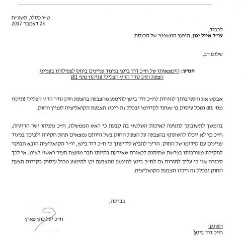 "אבקש את התערבותך להורות לח"כ ביטן להימנע מההצבעה בהצעת חוק סדר דין הפלילי (חוק ההמלצות) ומכל עיסוק בו", דברי כהן פארן.