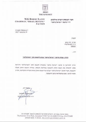 עוד כתבו במכתב כי במידה והצעת החוק כן תעלה להצבעה, חברי סיעת "ישראל ביתנו" יצביען נגד.