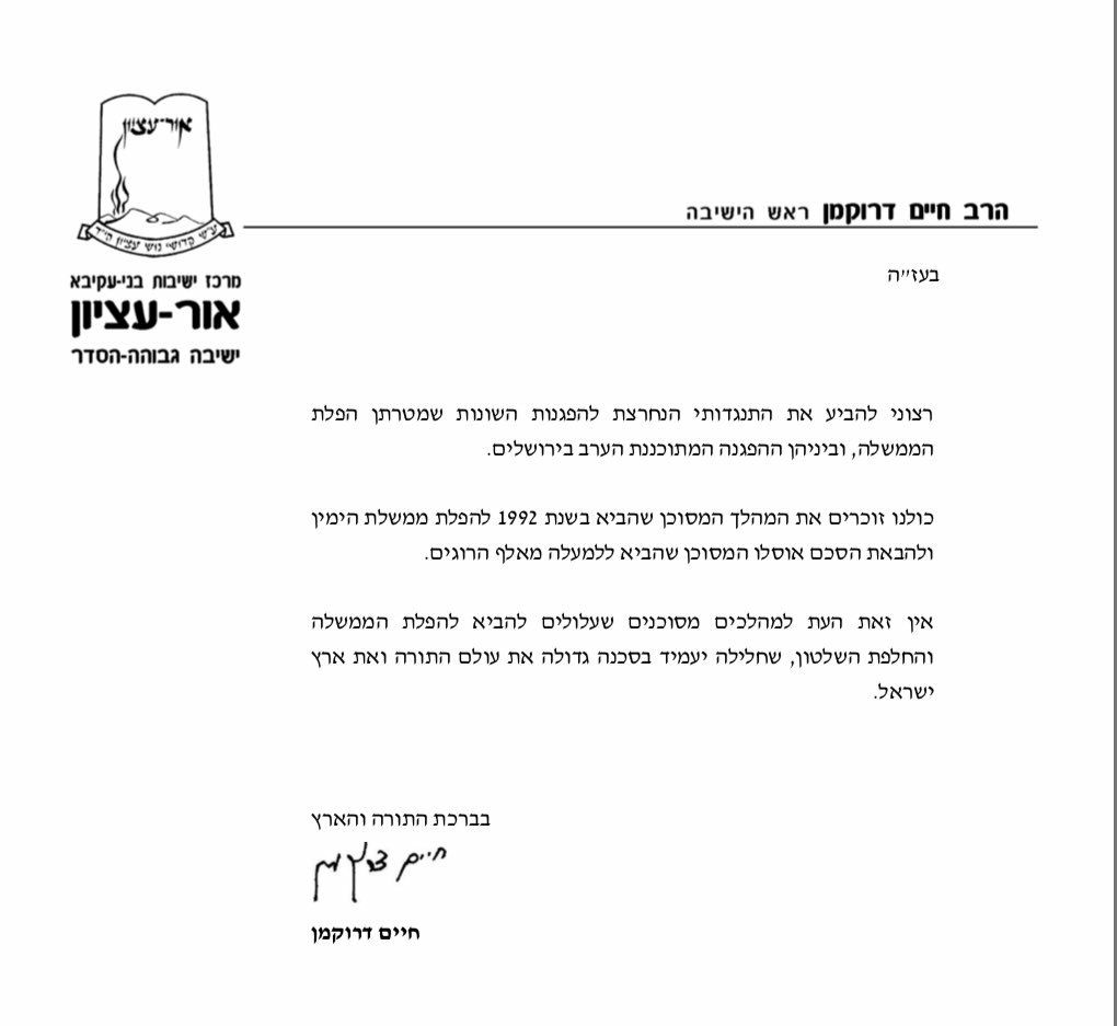 "כולנו זוכרים את המהלך המסוכן שהביא בשנת 1992 להפלת ממשלת הימין ולהבאת הסכם אוסלו המסוכן שהביא ללמעלה מאלף הרוגים. אין זאת העת למהלכים מסוכנים שעלולים להביא להפלת הממשלה והחלפת השלטון, שחלילה יעמיד בסכנה גדולה את עולם התורה ואת ארץ ישראל."