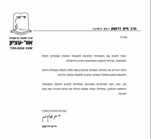 "רצוני להביע את התנגדותי הנחרצת להפגנות השונות שמטרתן הפלת הממשלה, וביניהן ההפגנה המתוכננת הערב בירושלים." כותב הרב דרוקמן.
