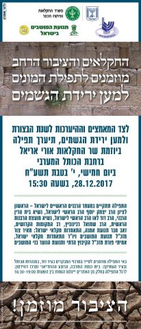 שר החקלאות אורי אריאל אמר כי "לדאבוננו, לאחר ארבע שנות בצורת ירדו עד כה מעט גשמים שהם פחות מהממוצע הרב שנתי והחורף הנוכחי מסתמן כשחון, אני קורא לכל הציבור לקחת חלק בתפילה ב י' בטבת שכידוע הינו יום תענית, בכותל המערבי, ולהביא מטריות כי ביחד נקרע את שערי השמים".