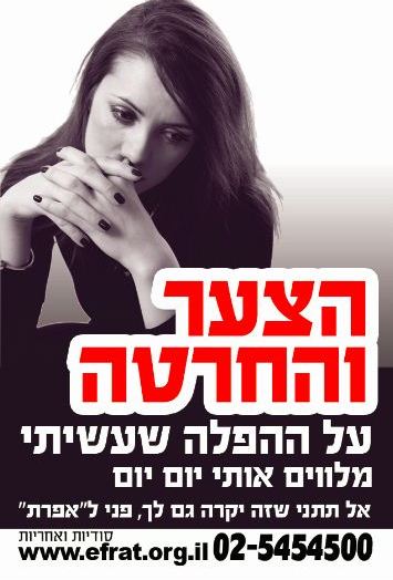 על השלט מופיעה דמות של אישה הנראית עצובה, כשמתחתיה נכתב: "הצער והחרטה על ההפלה שעשיתי מלווים אותי יום-יום. אל תתני שזה יקרה גם לך. פני ל'אפרת'".