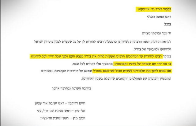 אחרי מכתב התמיכה ששיגרו מספר רבנים מהציונות הדתית לרמטכ"ל, רב- אלוף גדי אייזנקוט, הבוקר (חמישי) פורסם בגל"צ כי מכתב נוסף נשלח עליו עליו חתומים "בני ובנות הציונות הדתית".