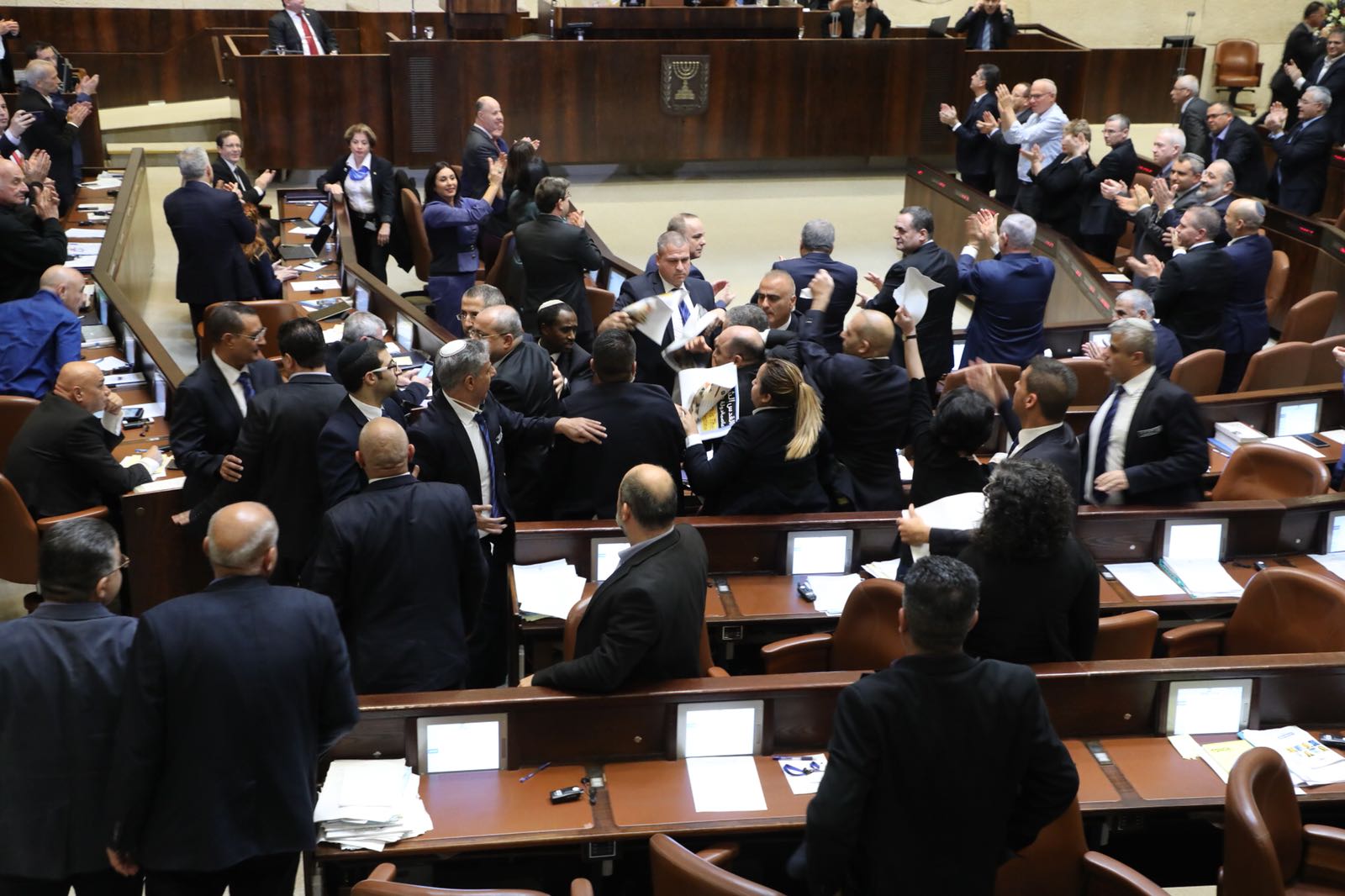 מבוכה בכנסת. חברי הכנסת של הרשימה המשותפת, הניפו כרזות במליאת הכנסת בזמן נאומו של סגן נשיא ארה"ב מייקל פנס.