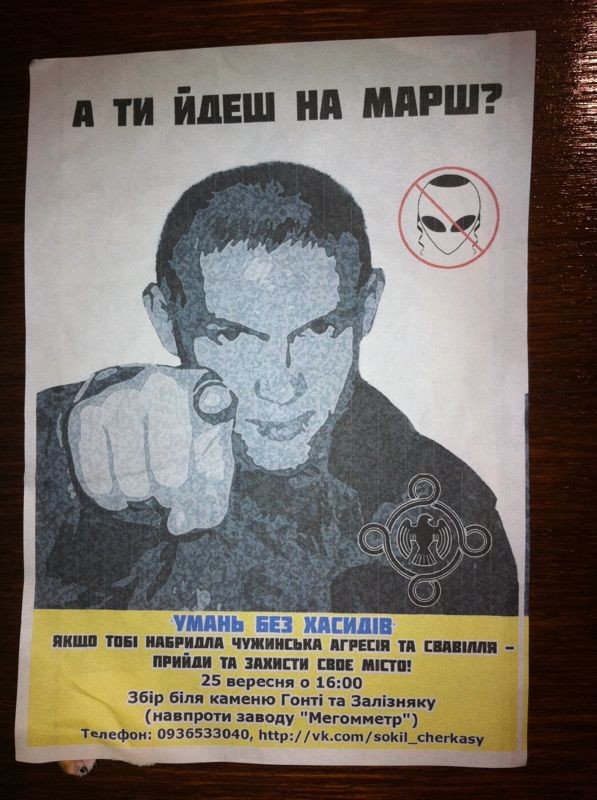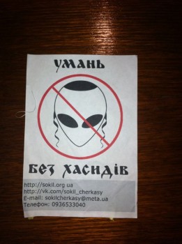 בשלטים מצויירים החסידים כחייזרים עם פאות משתלשלות ועליהם נמתח קו. בצד המודעה נכתב "אם אתה לא רוצה חסידים באומן – תבוא גם אתה למפגן הכוח".