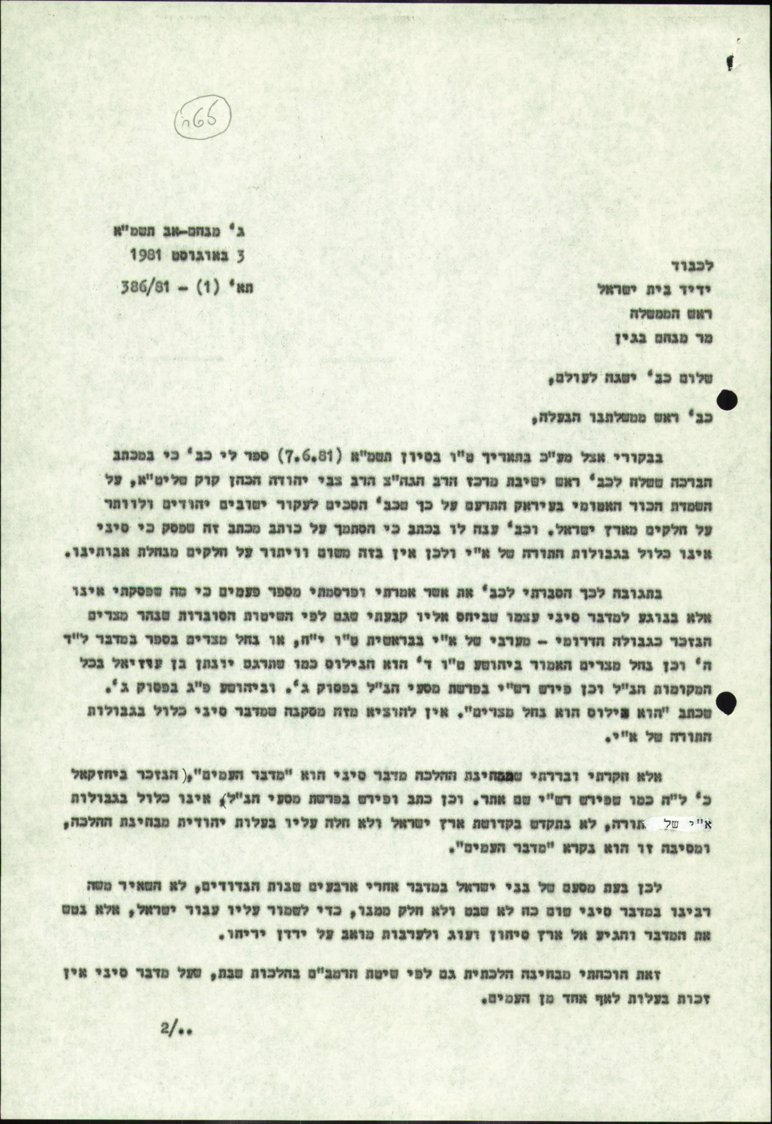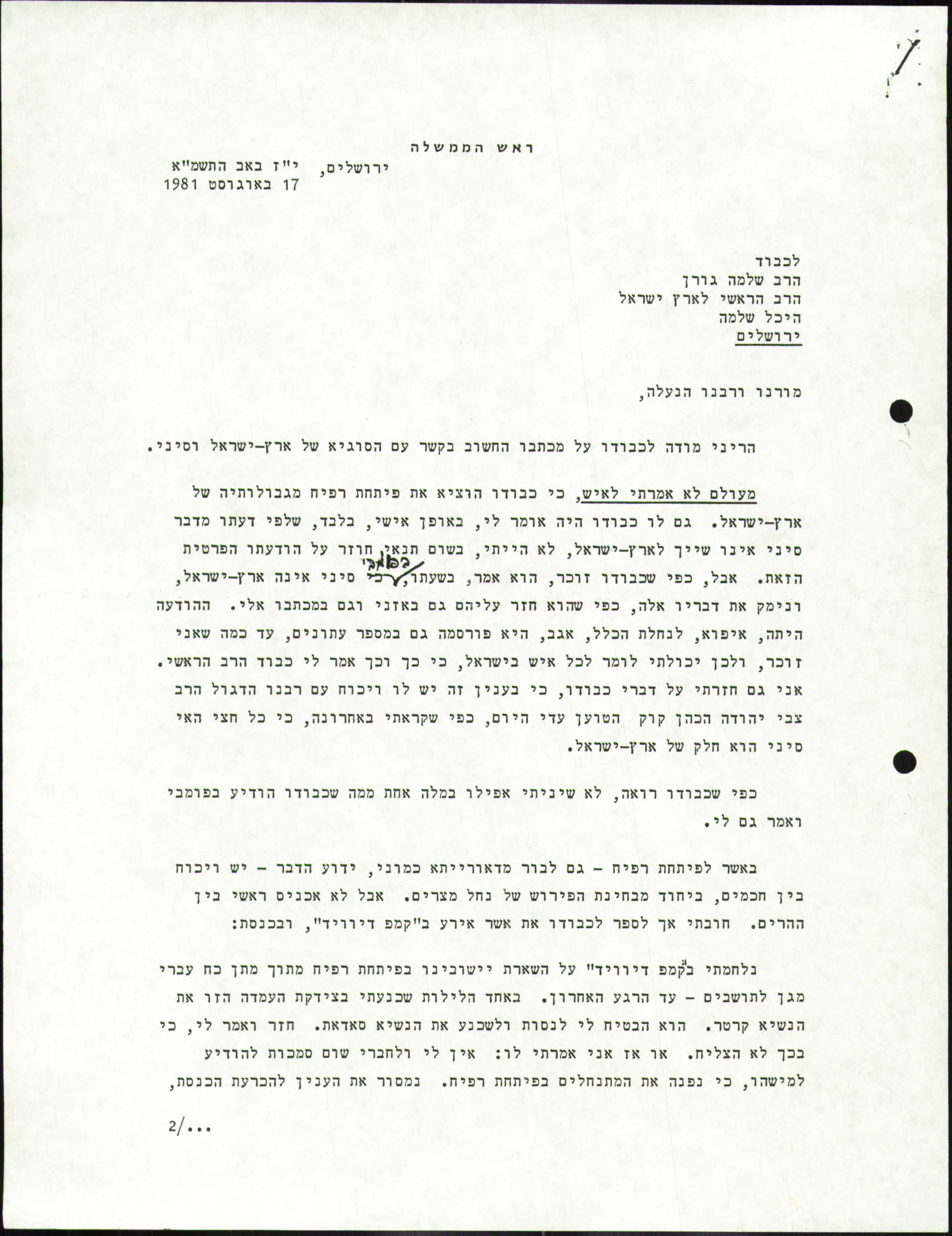 הריני מודה לכבודו על מכתבו החשוב בקשר עם הסוגיא של ארץ ישראל וסיני.