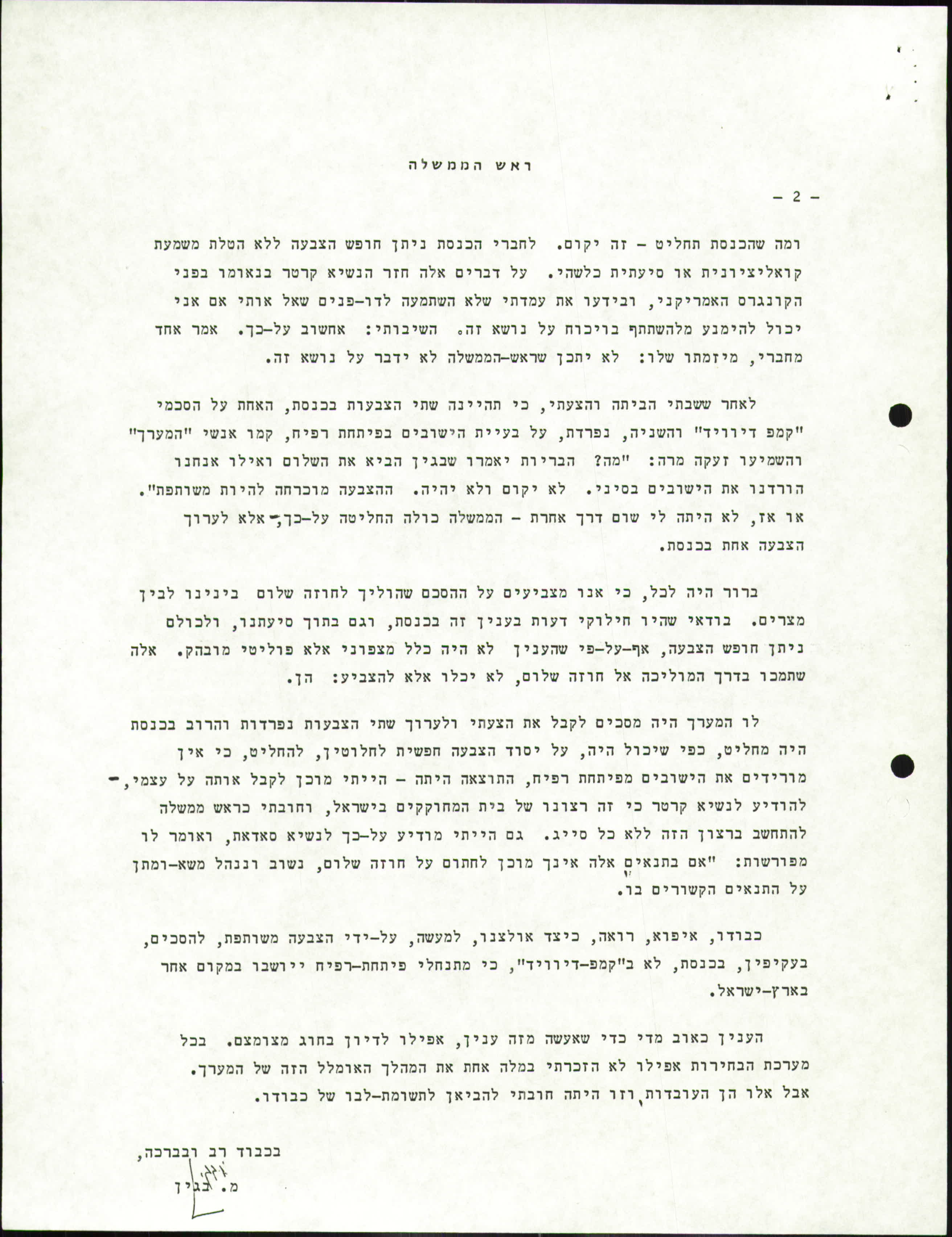 בהמשך המכתב מסביר בגין, כי את ההחלטה על פינוי חבל ימית השאיר לכנסת, שם ברוב עצום של קולות, כולל מפלגת העבודה והמפד"ל הוחלט על פינוי כל סיני כדי לא לחבל בהסכמי השלום.