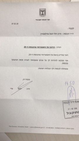 אולם הוסיף כי "לאור העובדה, שהפרסומים המגמתיים מטילים צל כבד על פועלי רב השנים למען ביצור בטחונה של מדינת ישראל וכמו כן על הערכים אותם מייצגת מפלגת יש עתיד, החלטתי לקחת פסק זמן מפעילותי הציבורית ולהגיש את התפטרותי מהכנסת".