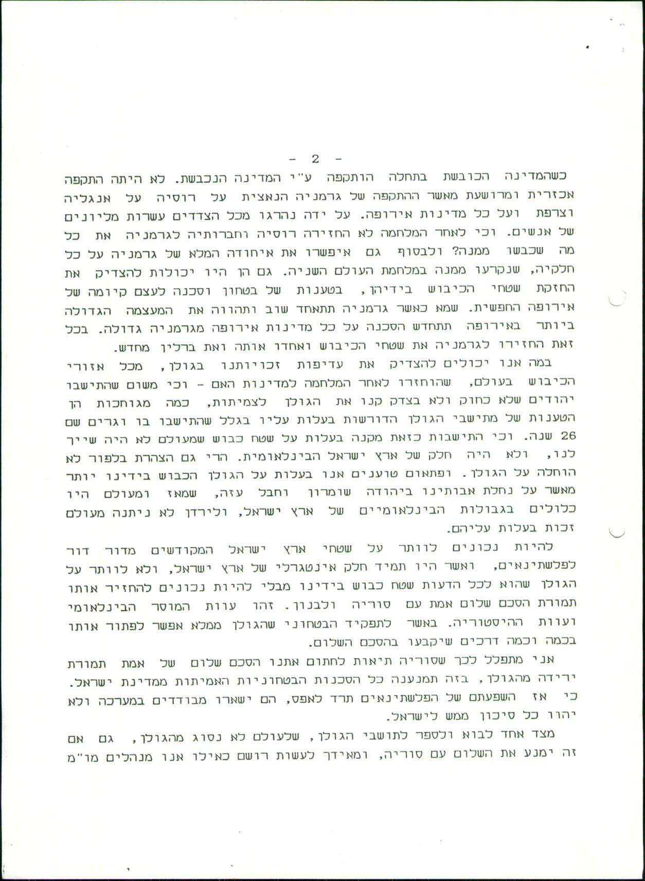 א. אם לא יחזירו לסוריה את כל הגולן, ואם לא יקבל בגולן את כל מה שקיבל סאדאת בסיני, לא יהיה לעולם שלום עם סוריה מכיון שהגולן מעולם לא היה כלול, לא כולו ולא חלק ממנו, בגבולות מדינת ישראל ואנו שולטים שם רק בכח הכיבוש שלנו, שבזמנו נכפה עלינו. אבל אסור להתעלם מעובדה היסטורית זו שהגולן הוא שטח כבוש, על אף האינטרס הצר של כמה מקיבוצי האזור ומתיישבי הגולן, ועל אף החלת החוק הישראלי על הגולן בכנסת, הם הפכו בהבל פיהם את הגולן כשטח ישראלי ריבוני, מה שאינו נכון לא מבחינת החוק הבינלאומי ולא מבחינת ההלכה היהודית. כפי שברררתי בכמה מאמרים הלכתיים בנושא זה.