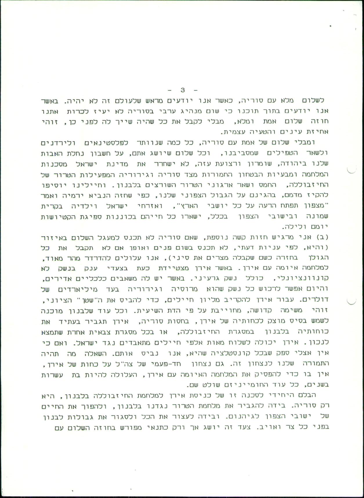 אותו התהליך ואותן השגיאות, שעשתה גולדה מאיר ע"ה ביחס לשלום עם מצרים הנך עומד לעשות עם סוריה. אני משוכנע בנושא זה בשני דברים: