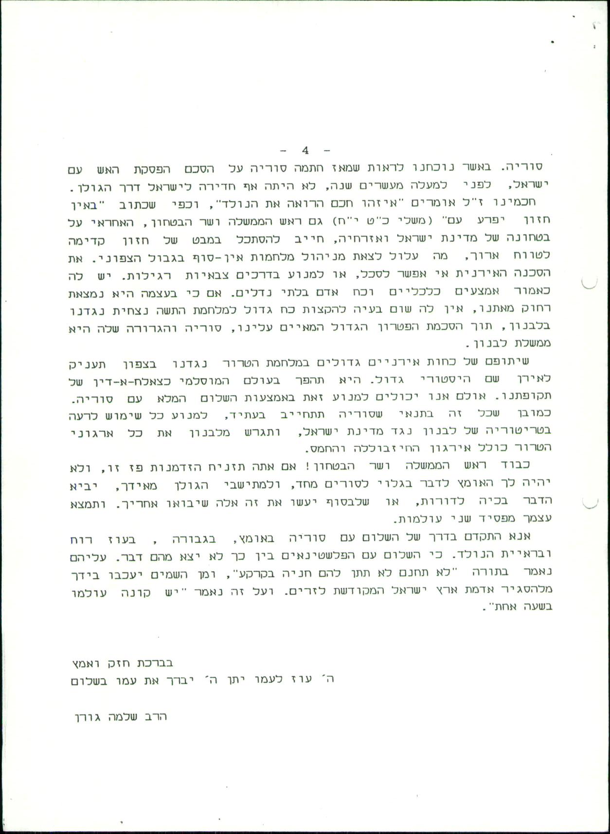 ומפציר בו כי עדיף להחזיר את רמת הגולן לסורים מאשר את יהודה ושומרון לפלסטינים: "אנא התקדם בדרך של השלום עם סוריה באומץ, בגבורה, בעוז רוח ובראיית הנולד. כי השלום עם הפלשטינאים בין כך לא יצא מהם דבר. עליהם נאמר בתורה "לא תחנם – לא תתן להם חניה בקרקע", ומן השמים יעכבו בידך מלהסגיר אדמת ארץ ישראל המקודשת לזרים. ועל זה נאמר "יש קונה עולמו בשעה אחת".